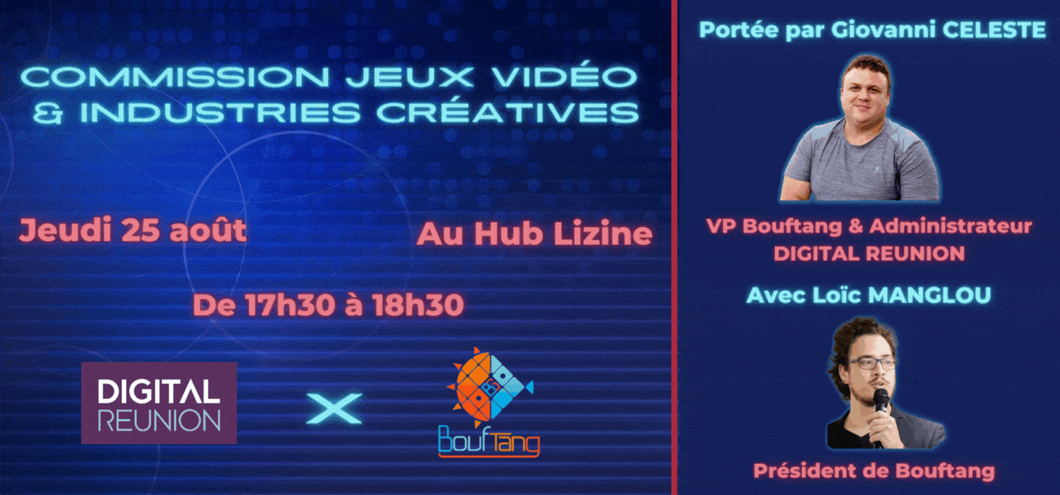 Porté par Giovanni CELESTE (Fondateur @ Dodorassik Games, VP @ Bouftang & administrateur @ DIGITAL REUNION) c’était l’occasion de (re)découvrir ces industries et leurs opportunités à travers une présentation de la filière et un échange rempli de passion avec Loïc MANGLOU – Président de Bouftang. 🎮